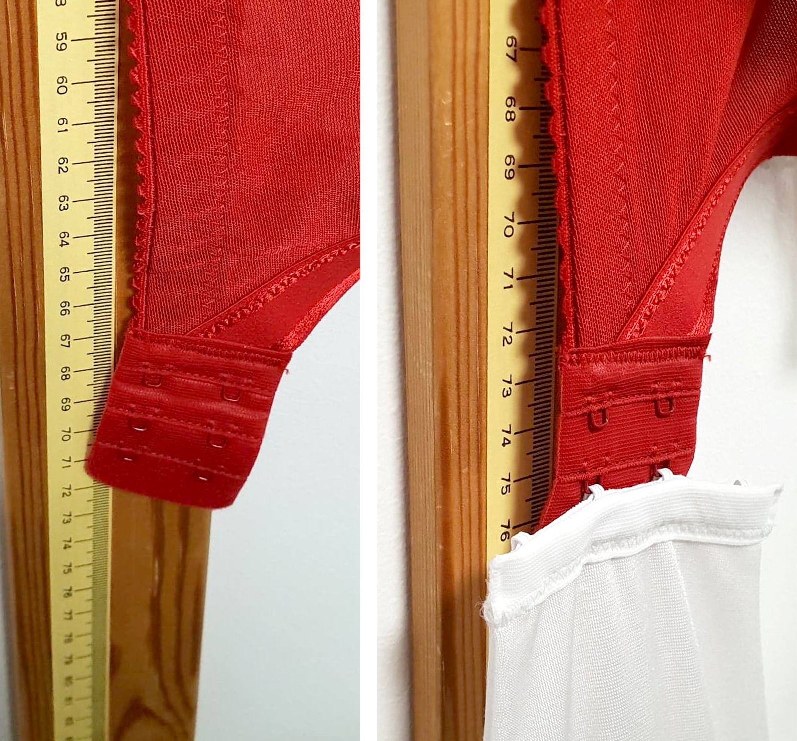 Miss Maryllä suoritetaan mittatestit painoilla liivien oikean ympärysmitan varmistamiseksi. Näiden liivien koko on 75C. Vasemmalla näet, että liivien pituus keskimmäisiin hakasiin on ”löysänä” 70 cm. Päälle puettuna ne kuitenkin venyvät 75-senttisiksi, kuten oikealla painotestistä nähdään.